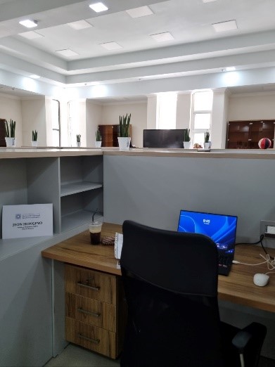 연구소는 세계경제외교대학교 내 D 건물 2층에 위치해 있습니다. D 건물 1층에는 한국학 센터와 도서관이 있습니다. 고등국제연구소는 현재 신생 연구소이기 때문에 연구소 내부에 회의실을 공사하고 있으며, 연구실 각 자리에 데스크탑이 아직 구비되어 있지 않아 저는 개인 노트북 및 태블릿으로 연구를 수행하고 있습니다. 그럼에도 개인 자리가 상당히 넓고 최신식으로 되어 있어 원활하게 연구 활동을 하고 있습니다.