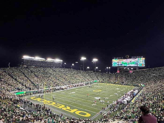 이달에는 유진 지역의 문화와 분위기를 체감할 수 있는 경험들을 많이 하였습니다. Oregon Ducks 풋볼 경기를 관람하였는데, University of Oregon 대학 풋볼팀은 미국 대학 풋볼 리그 내에서도 상위권에 속하는 팀으로, 풋볼 시즌이 시작되면 경기 당일 캠퍼스와 도시 전반이 응원 분위기로 가득 찹니다. 친구들과 함께 경기를 관람하며 미국 사회 전반에 자리 잡은 풋볼 문화의 열기를 직접 느낄 수 있었습니다.