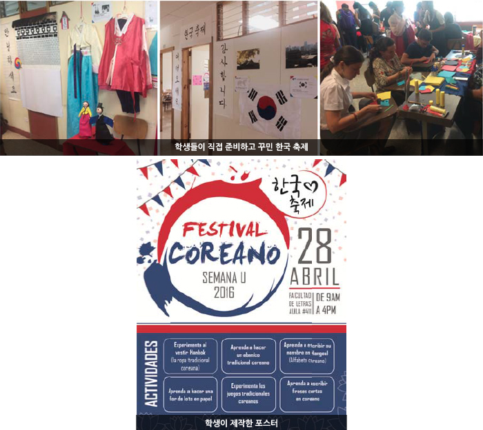 대학생 주간(Semana U)에는 처음으로 ‘한국 축제’를 열었는데 한국어 수업을 수강하는 학생들이 자발적으로 코너를 맡아서 순조롭게 진행되었습니다. K-pop 감상, 한글 책갈피 만들기, 부채 만들기, 연꽃 만들기, 전통 놀이(딱지, 실뜨기, 제기 차기 등) 체험, 한복 입기 등을 마련했는데 공간이 비좁을 정도로 많은 사람들이 찾아 주었습니다. 무엇보다 준비한 학생들과 찾아 온 학생들 모두가 아주 즐거워한 행사였습니다. 내년에는 다른 기관과 협력하여 규모를 조금 더 크게 할 생각도 갖고 있습니다.