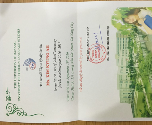 지난 9월 19일(월요일)에는 다낭대학교의 공식적인 행사인 First Day of School ceremony가 있었습니다. 각 학과의 교수진과 학생, 교직원, 학교 임원, 지역 귀빈을 초청하였고, 지난 일년 과 앞으로의 일년에 대한 보고 및 학사 일정, 광고를 하였습니다. 학생들은 오프닝 베트남 전통 춤, 노래 등으로 공연을 하였고, 후원 재단이나 단체로부터 장학금을 수여하고 받는 자리가 있었습니다. 또한 외국인 선생님들도 단상으로 호명되어 축하를 받고 총장님으로부터 꽃다발을 받았습니다. 한 해의 시작을 알리는 중요한 행사인 만큼 그 열기 또한 뜨거웠습니다.