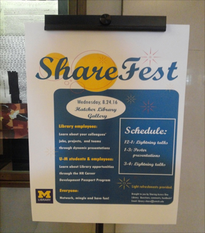 ‘나눔축제’라고도 할 수 있는 도서관 ShareFest 행사가 처음으로 열렸습니다. 약 7~8분짜리 Lightening Talk와 아이디어를 패널에 정리해서 소개하는 Poster session으로 구성되었습니다. 도서관에서 진행되고 있는 프로젝트나 이벤트, 부서 소개, 목표 공유 등의 내용으로 이루어졌습니다. 아시아도서관 관장인 Dawn Larson이 Lightening Talk에서 아시아 도서관의 역사와 규모, 업무 등을 소개했습니다. 본 행사는 기본적으로 도서관 내부 조직들간에 이해를 높이고 목표와 생각을 공유하고 나누는 자리로 기획되었습니다.