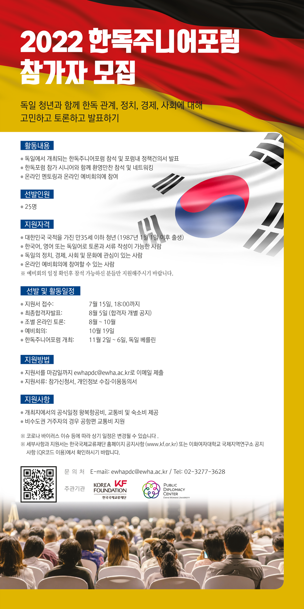 한국국제교류재단(KF)과 이화여자대학교 공공외교센터가 공동 주최하는 한독 주니어포럼은 한국/독일 청년이 함께 한독 관계, 정치 등에 대해 토론하며 정책건의서를 작성하고 발표하는 포럼입니다.